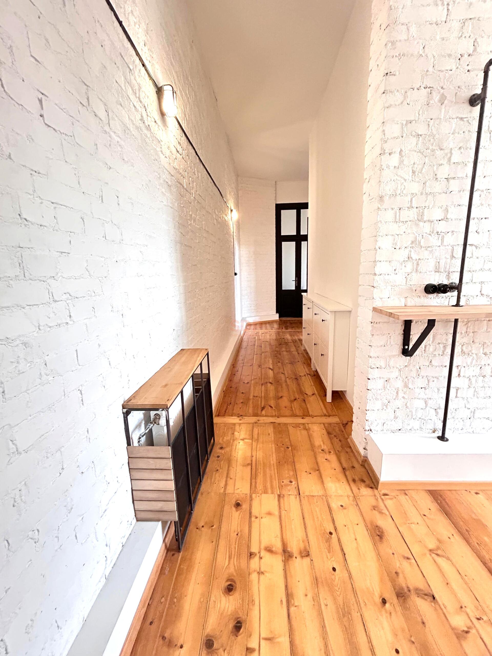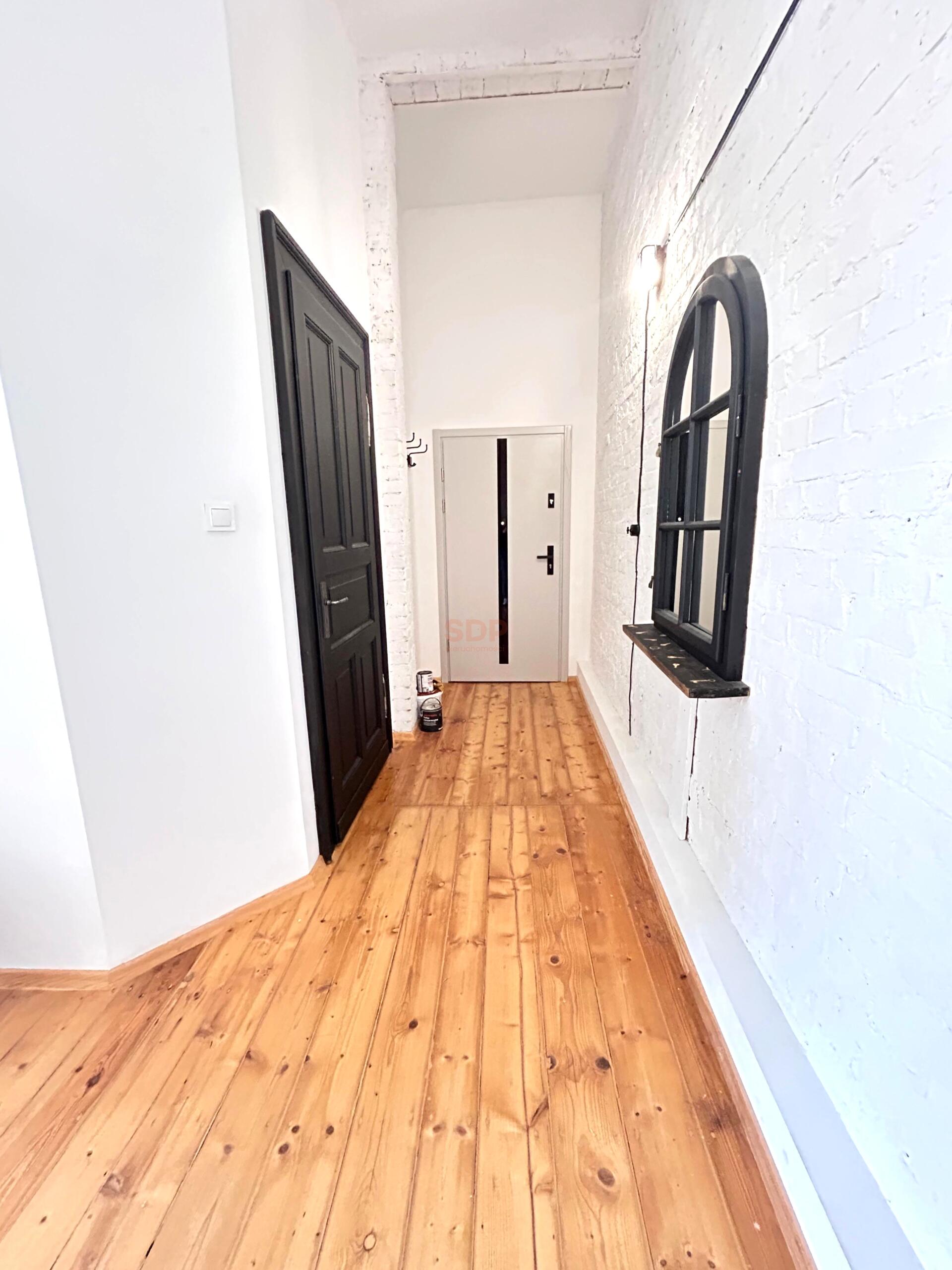 Drewniane podłogi i oryginalna stolarka drzwiowa unikalny klimat mieszkania.