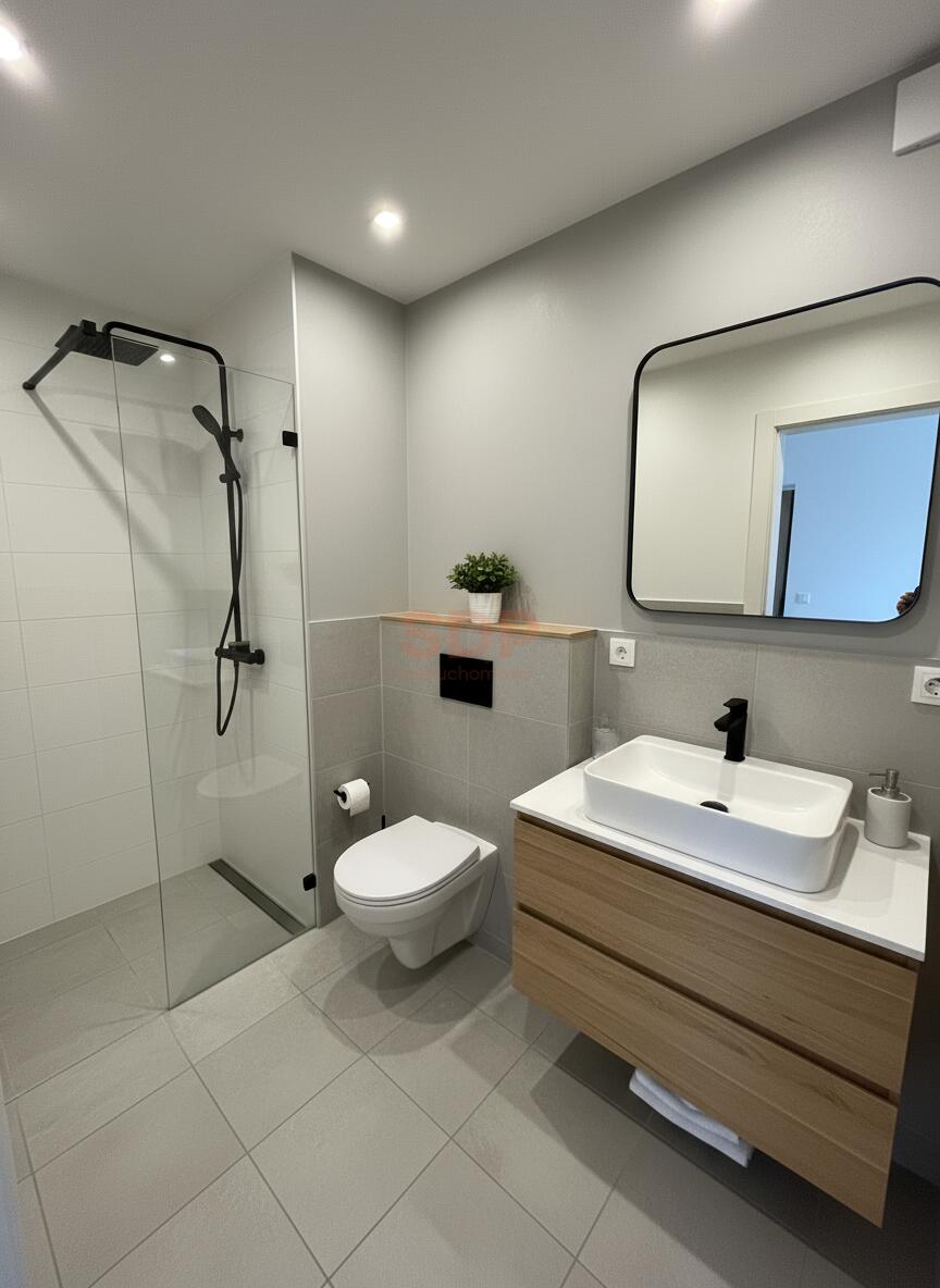 Zdjęcia pokoju i łazienki po remoncie przedstawiają wizualizację.
