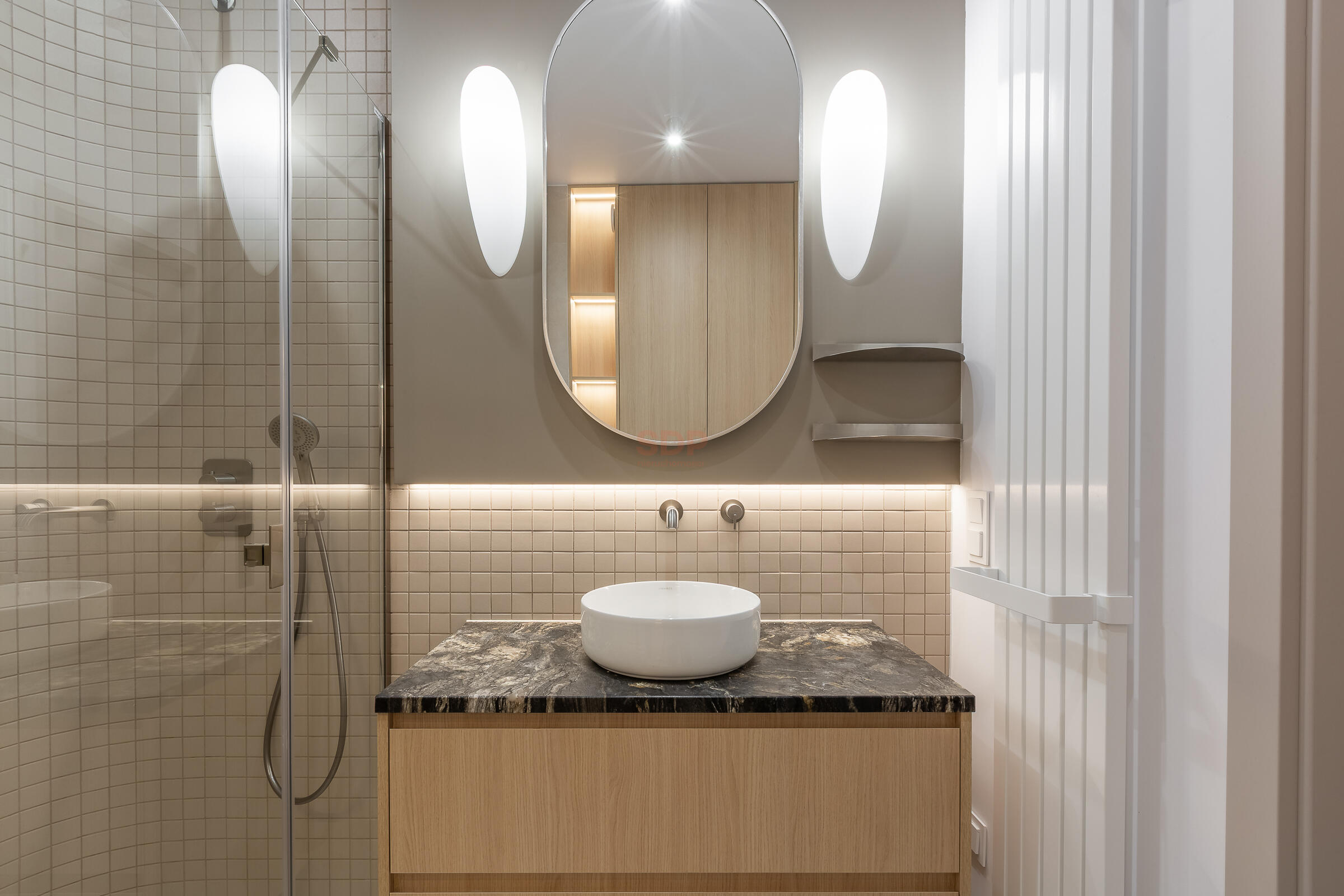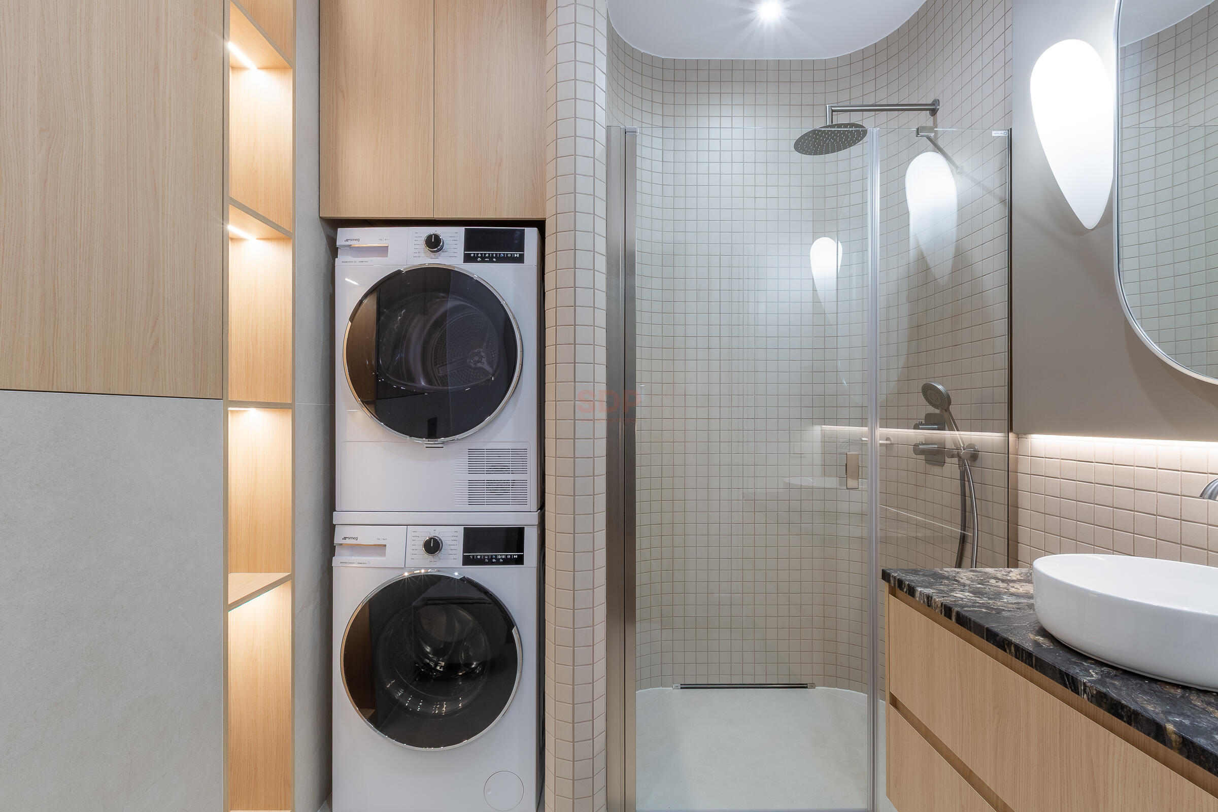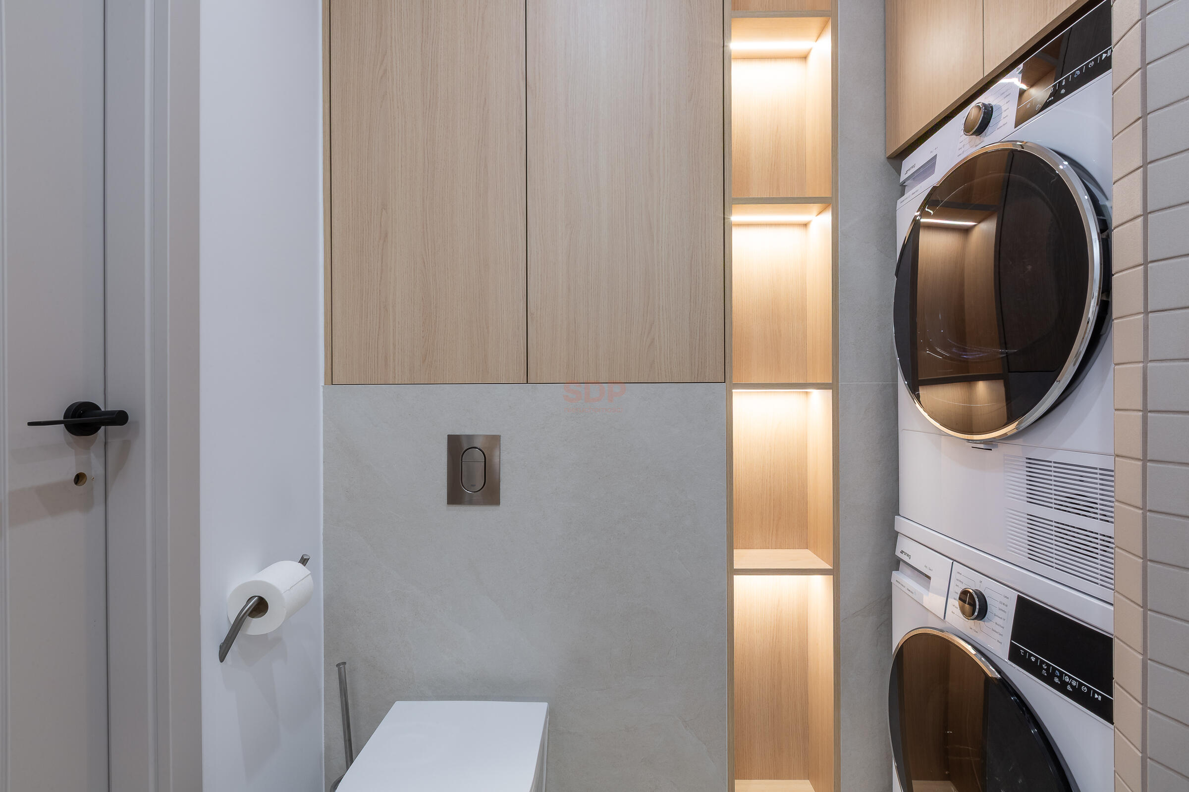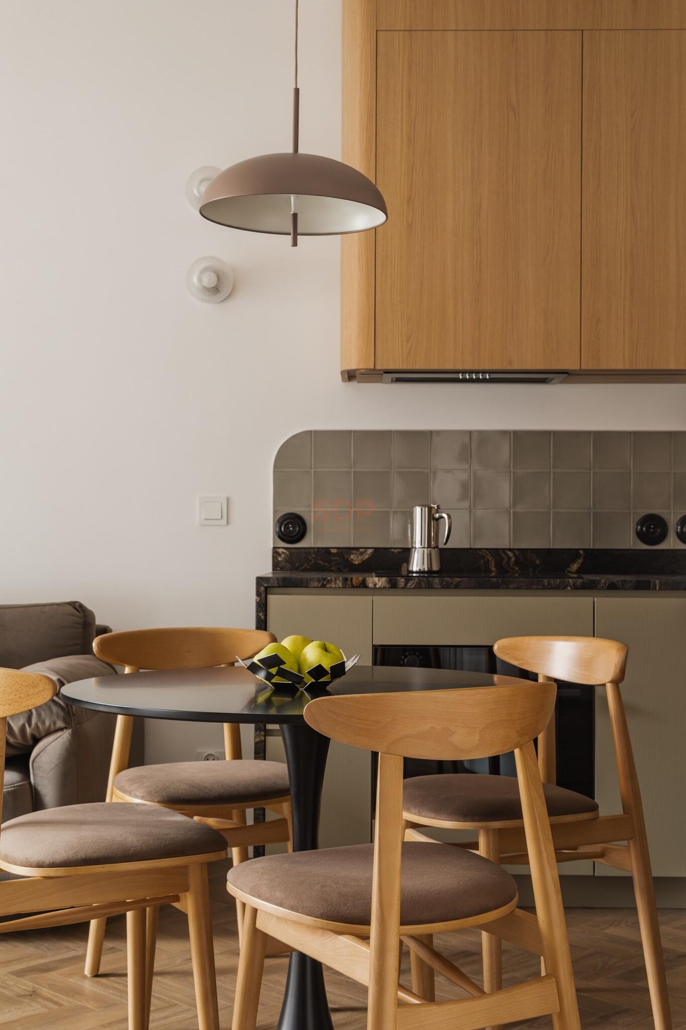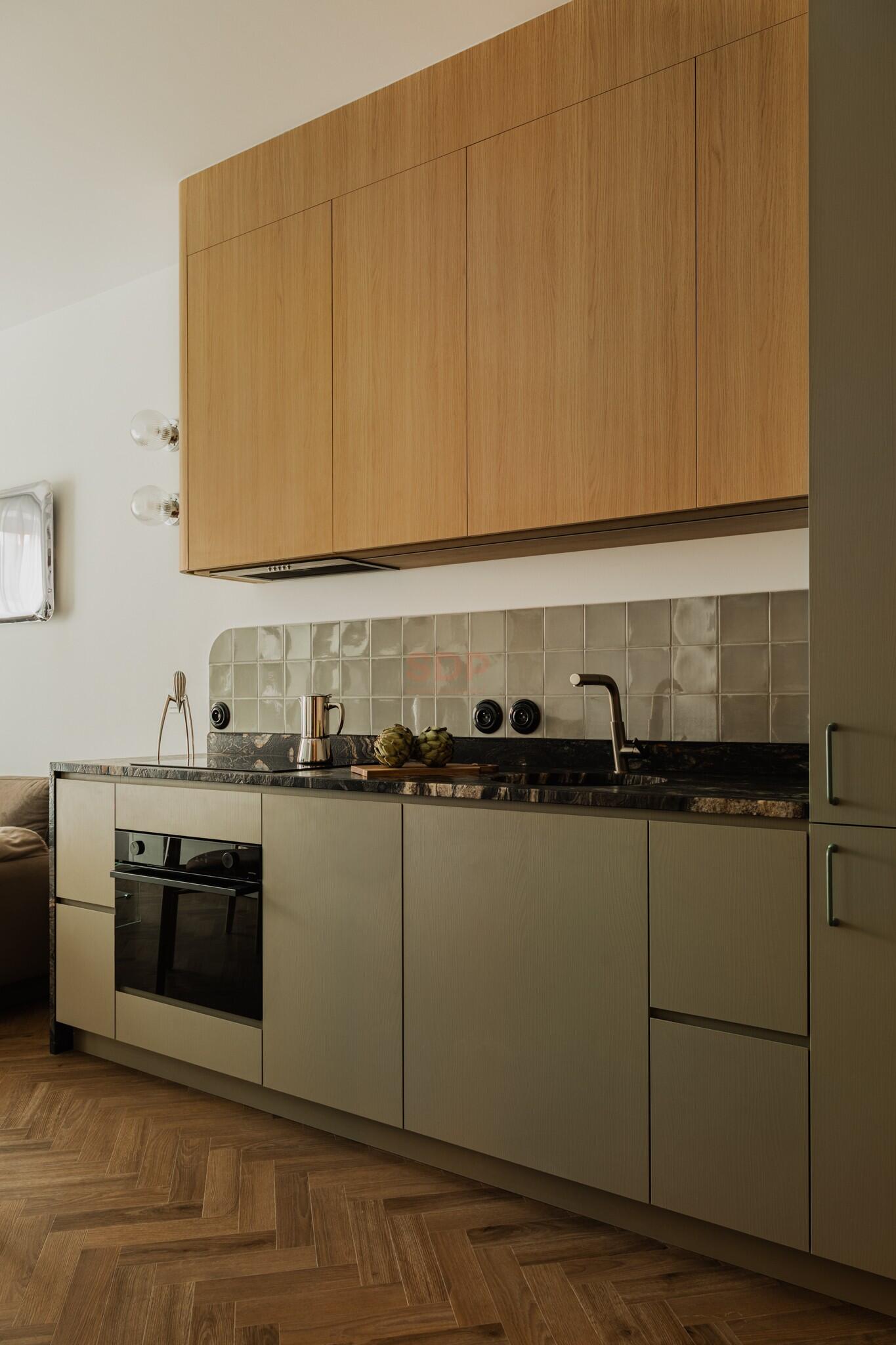 The apartment has underfloor heating and a swivel TV. The apartment is fully furnished. The built-in furniture was custom-made. The kitchen is fully equipped, including high-end appliances and a coffee machine. The countertops are made of NOBLE ARCO quartz conglomerate (kitchen and bathroom). The bathroom includes a clothes dryer. The apartment also includes an upright vacuum cleaner.
