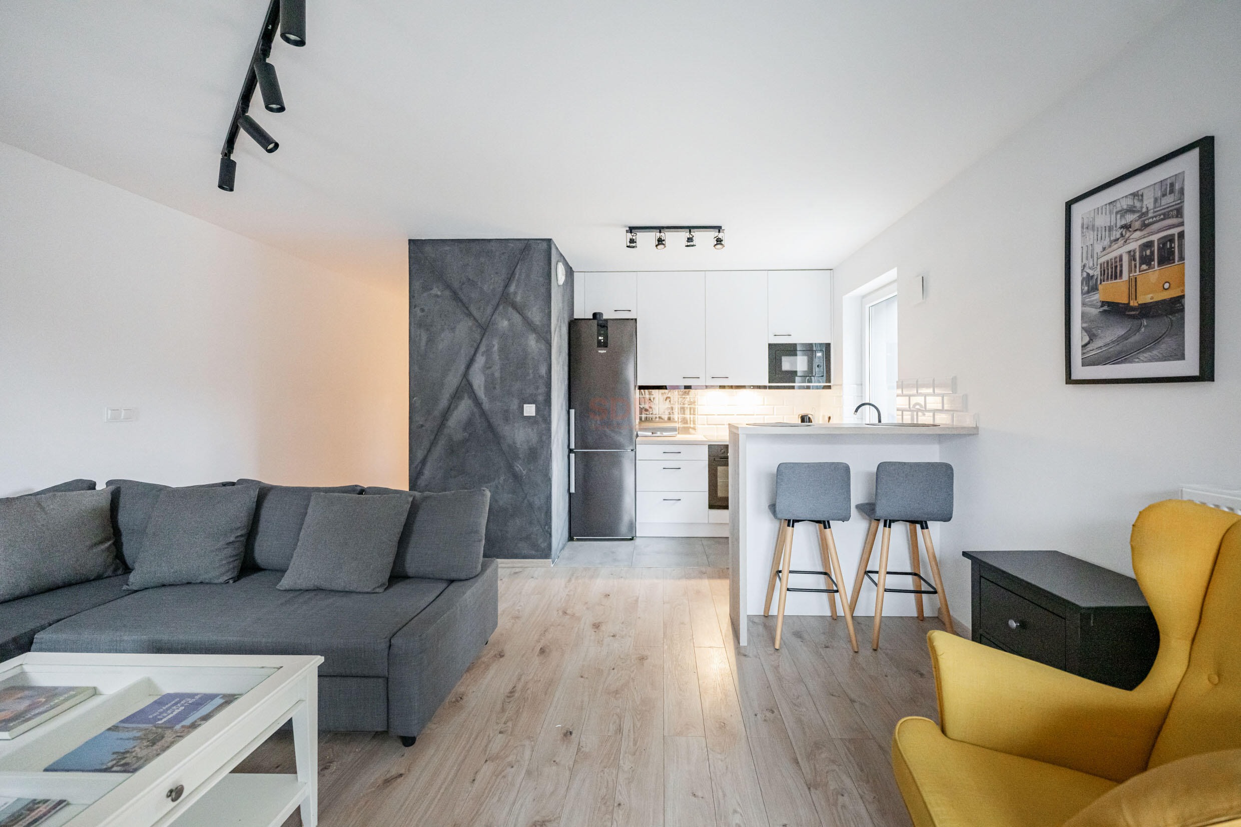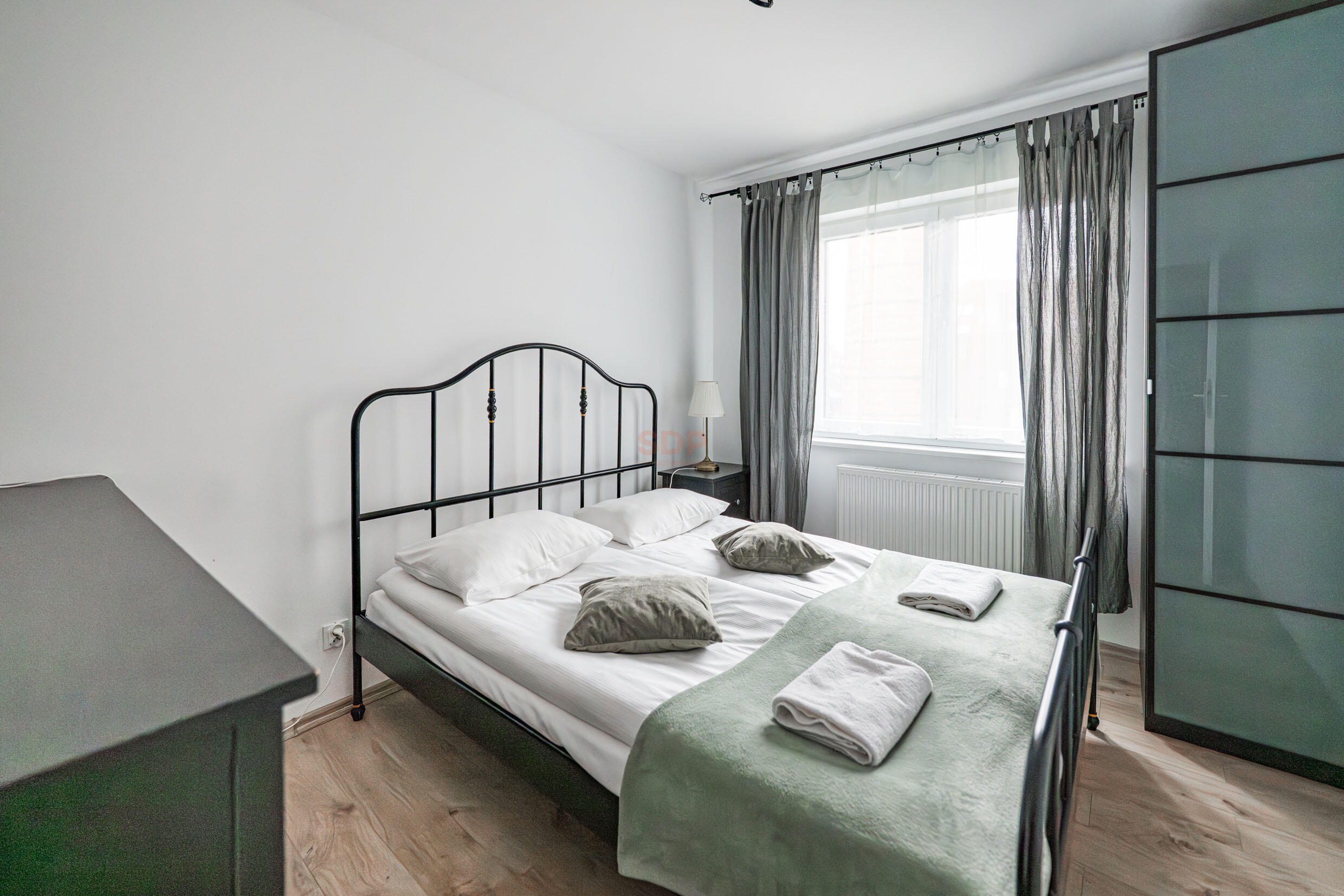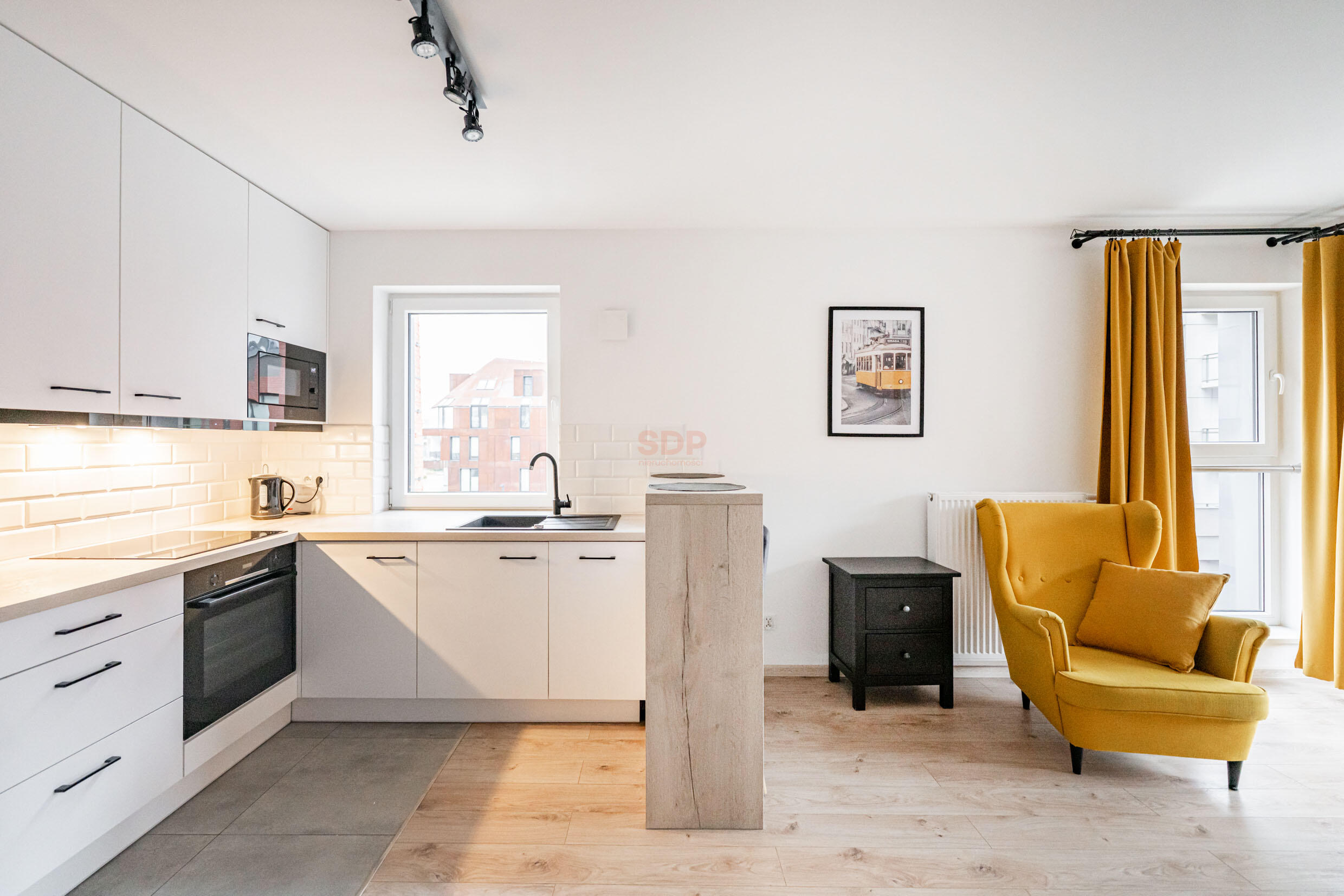 Kuchnia w pełni przemyślana, zabudowana wysokiej jakości meblami wyposażona w AGD najlepszych marek (płyta indukcyjna, pochłaniacz, piekarnik, zmywarka, chłodziarko- zamrażarka). Sypialnia z łóżkiem małżeńskim, pojemne szafy.