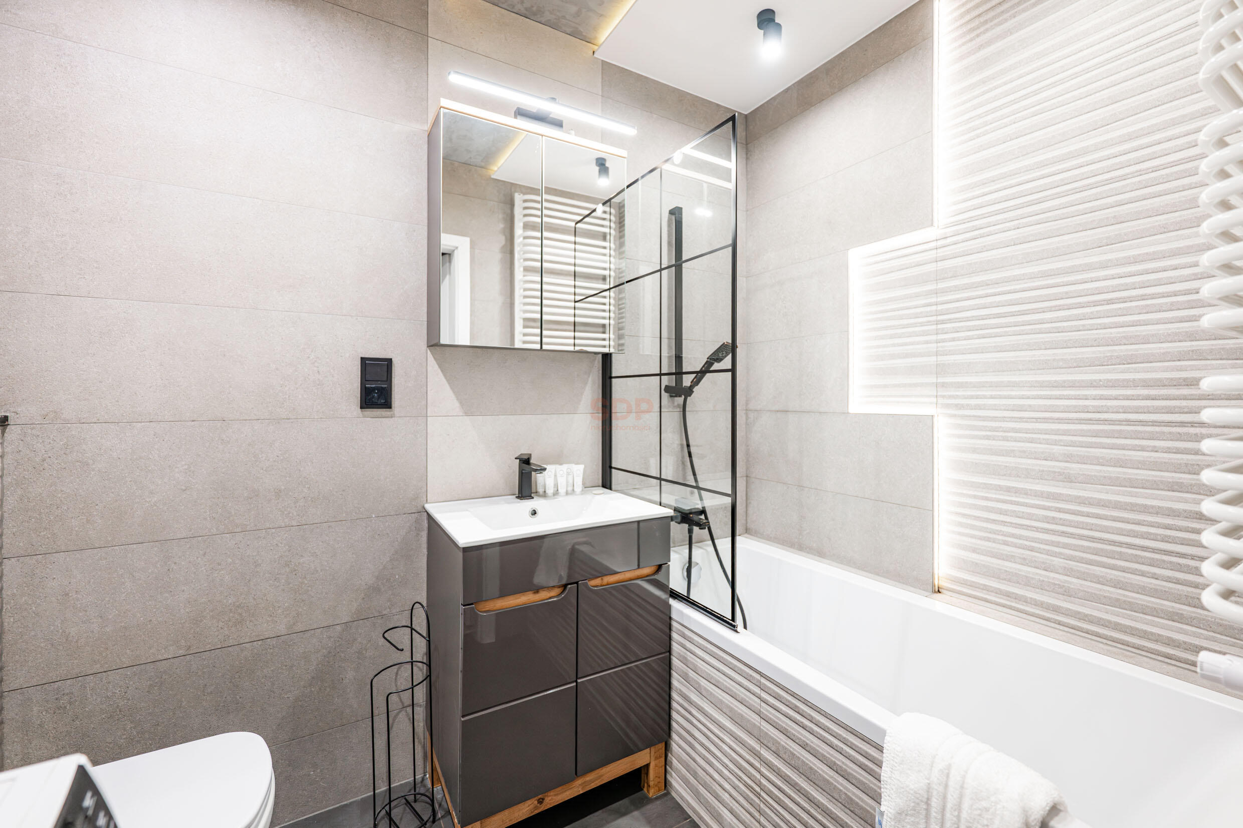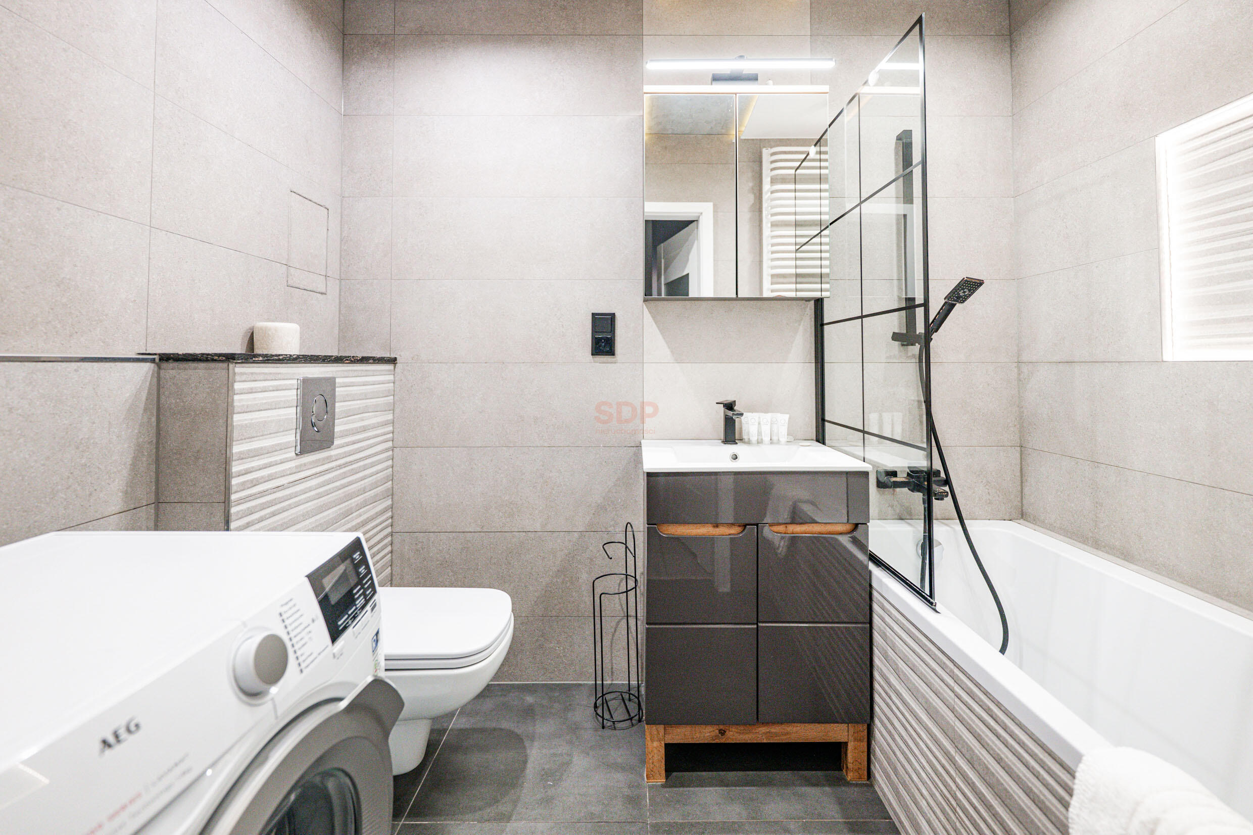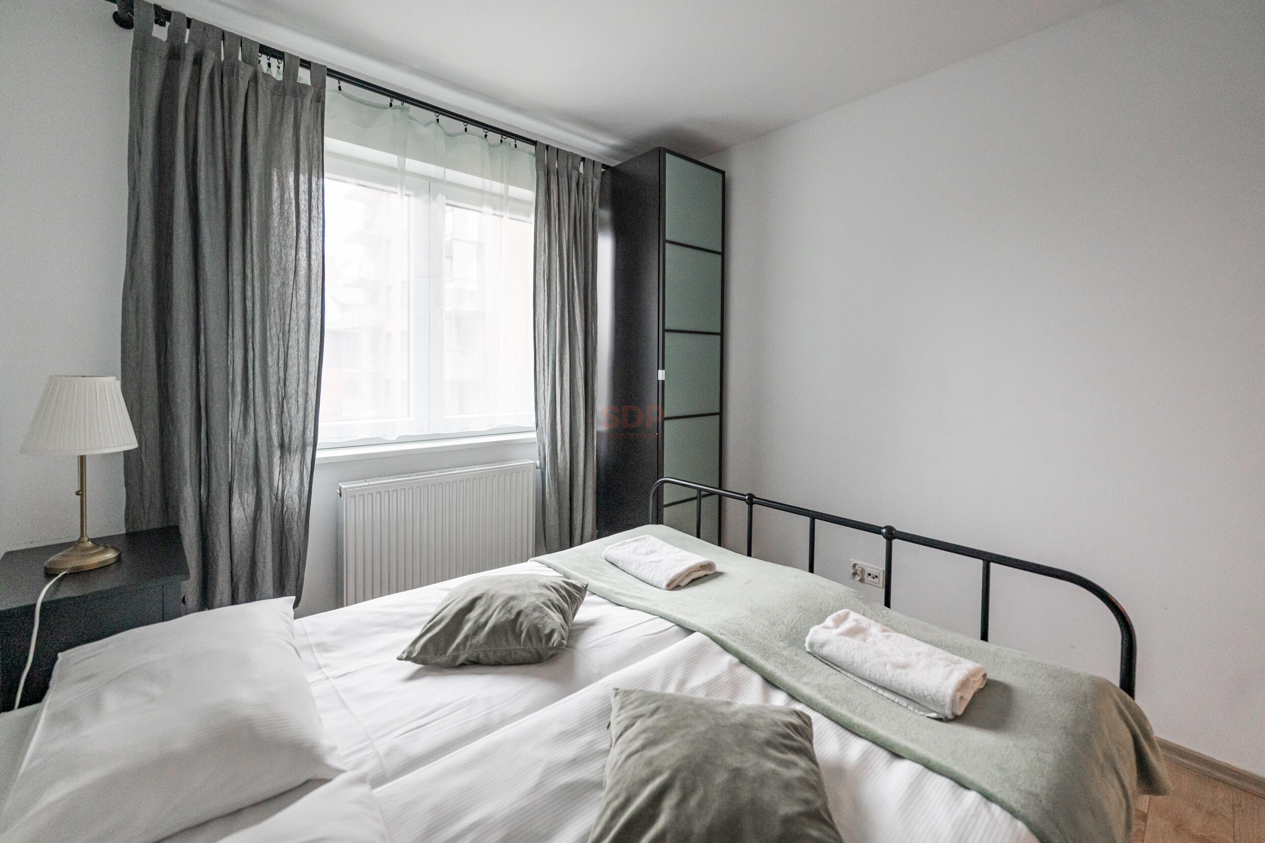 Kuchnia w pełni przemyślana, zabudowana wysokiej jakości meblami wyposażona w AGD najlepszych marek (płyta indukcyjna, pochłaniacz, piekarnik, zmywarka, chłodziarko- zamrażarka). Sypialnia z łóżkiem małżeńskim, pojemne szafy.