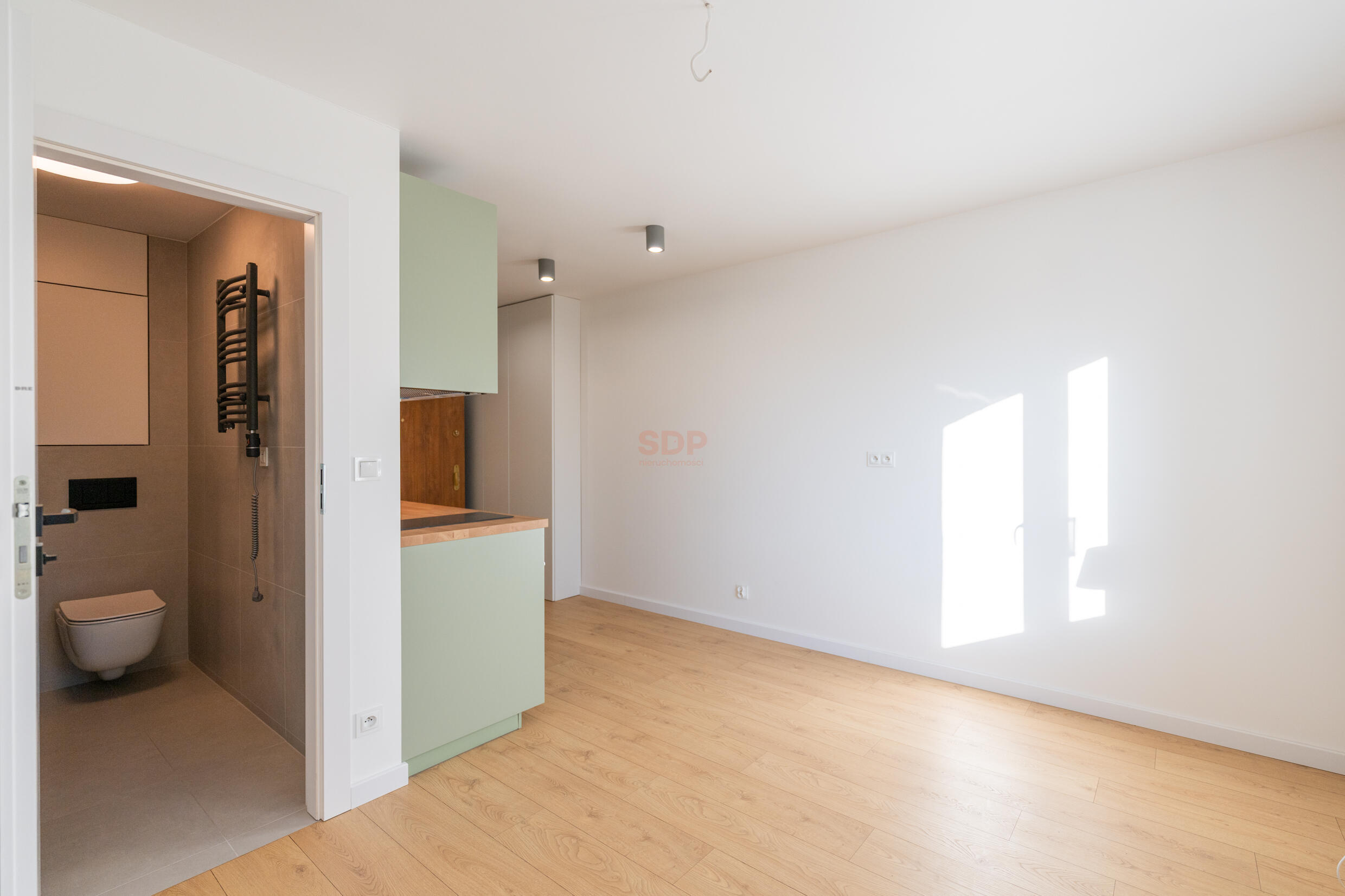 – Łazienka z prysznicem, toaletą, umywalką i miejscem na pralkę